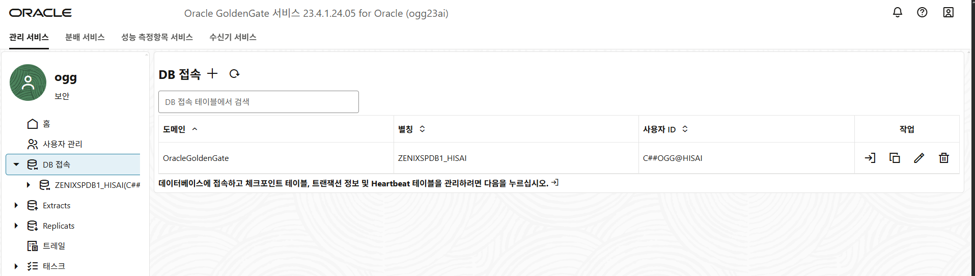 이번 포스팅에서는 ogg 23ai에서 데이터베이스를 연동하는 방법에 대해 소개하겠습니다.