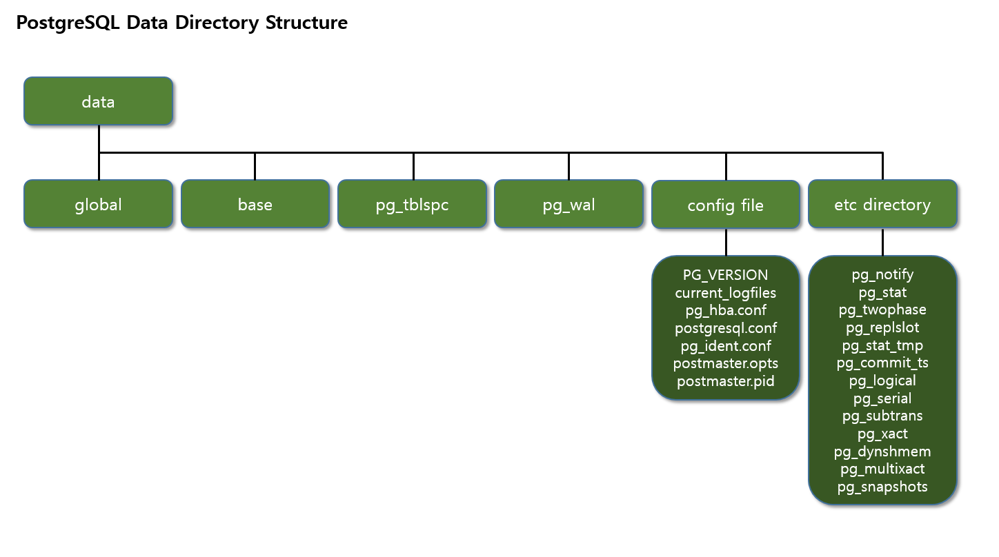 Physical Structure본 문서에서는 Data 파일, Engine Log 파일, Configuration 파일 등 PostgreSQL이 관리하는 다양한 파일과 디렉토리에 대한 내용을 다루도록 하겠습니다. 해당 파일 및 디렉토리들은 PGDATA라고